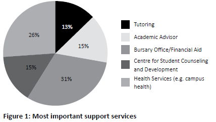 In Figures 1 and 2 below, most students indicated that they were aware of both the support services offered by the faculty and the CSCD. More than half of the students indicated that they had used at least one of the support services offered to them. Those who had previously used support services were asked what they considered to be the most important support services. They indicated that the bursary office/financial aid was the most important, followed by health (medical) services. The services offered by the academic advisor and the CSCD were considered of equal importance, and tutoring was the least important support service on offer.