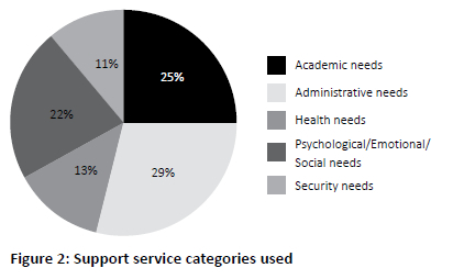 Students were asked to indicate the support service categories used, and they indicated that support services related to administrative, academic, and psychological/emotional or support needs were the most frequently used.