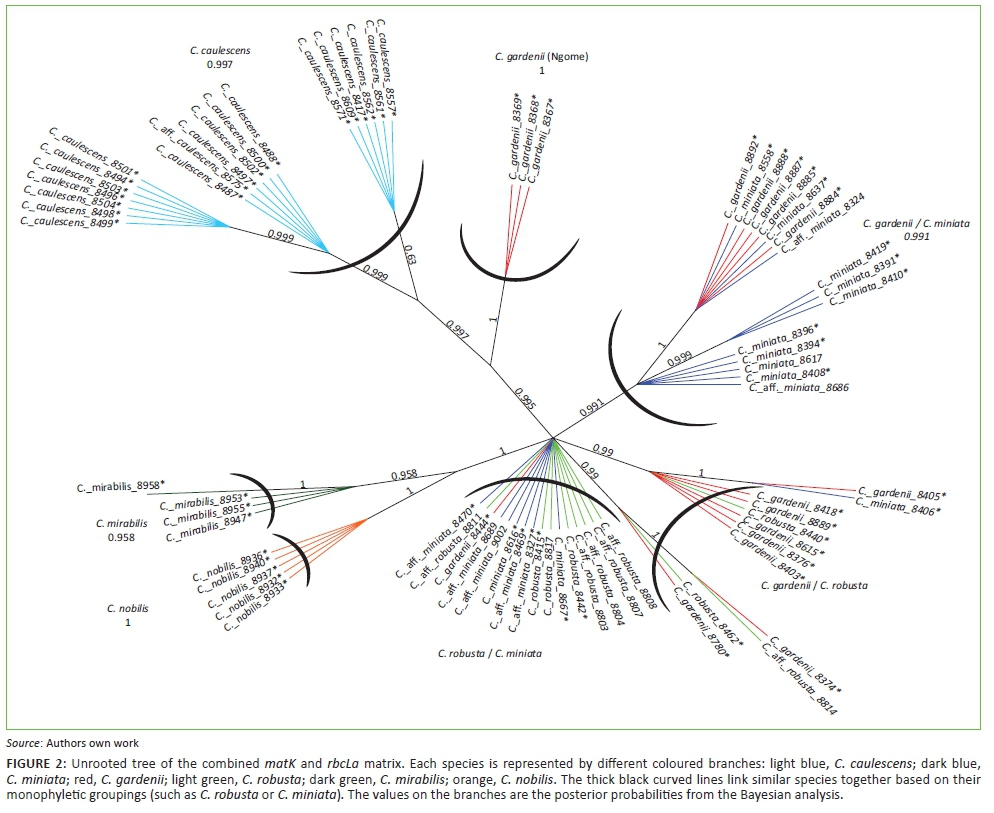 Three species are molecularly distinct in the BI cladograms and network based on the combined matK and rbcLa data set. These are C. mirabilis, C. nobilis and C. caulescens. This finding supports previous findings of clear lineage formation involving these three species (Spies, Grobler & Spies 2011). An unknown sample falling in the same monophyletic groups as any of these species in a BI cladogram has a posterior probability of 1.0 of belonging to C. mirabilis or C. nobilis and a posterior probability of 0.997 of belonging to C. caulescens.