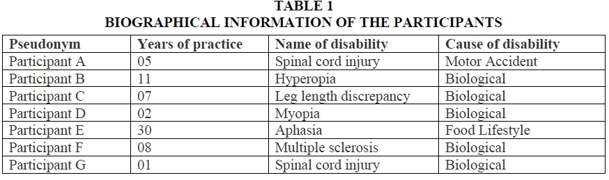 Semi-structured one-on-one interviews were carried out with seven social workers living with disabilities in South Africa using an interview schedule with open-ended questions. These interviews allowed participants to have the freedom to digress and introduce their own issues during the interviews. De Vos, Strydom, Fouché and Delport (2011) state that semi-structured one-on-one interviews are used primarily to get a clear picture of participants' convictions about a specific topic. Thematic analysis was used for the data analysis, as suggested by Bryman (2012). This involved scanning of the raw data, which were transcribed, arranged and organised for analysis. This also allowed for scanning of incomplete, inaccurate, inconsistent and/or irrelevant data in order to organise data into relevant categories. Data were organised into a manageable format or into groups in terms of descriptions, common words, phrases, themes or patterns of information, which were categorised according to smaller relevant pockets of information (Braun & Clarke, 2006). Tabulation was the best format for representing the data in ways that provided meaningful summaries and interpretations, and by selecting quotations from the responses to questions posed during the face-to-face interviews.