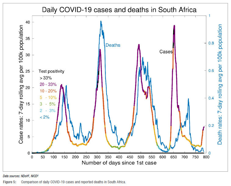 This decoupling between trends during the Omicron wave can be attributed primarily to the high levels of population immunity in the South African community and to the emergence of a variant that is less virulent than previous strains. Estimates from seroprevalence surveys8 indicate levels of immunity of over 70%. With only 35% of the population having received at least a single vaccination dose9, the remaining percentage of immunity is due to natural immunity from previous infection. Whilst high levels of population immunity are favourable, and likely to continue to offer protection from severe disease10, this does confirm that the non-pharmaceutical interventions implemented over the past 2 years were not as effective in completely preventing such a large proportion of the population from getting infected in the first place. However, the interventions were effective in slowing down the rate of infection, thereby preventing spikes in severe disease and lessening the impact on health services during surges.