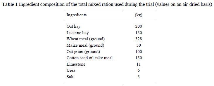 Four Holstein and four Jersey cows were used in the in situ study. The cows were non-lactating and fitted with rumen cannulae (Beruc, Johannesburg). The cows were individually housed in 4 x 4 m stalls in a closed barn with free access to fresh water. Wheat straw was used as bedding and was changed daily. For the duration of the trial the cows received a total mixed ration (TMR) ad libitum (Table 1) that contained 166 g/kg of CP, 10.7 MJ/kg of ME, 327 g/kg of NDF, 7.6 g/kg of Ca and 4.6 g/kg of P, all on a DM basis.