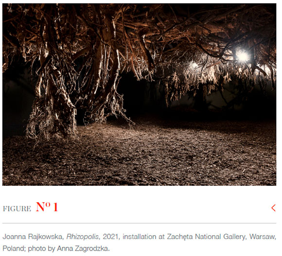 Like Ono, Joanna Rajkowska, a Polish artist working across diverse media and materialities, imagines a future habitat on earth, but unlike Ono, Rajkowska does not provide conceptual instructions for reflection. Instead, she invites us to immerse ourselves in an environment created from tree stumps and their roots, a futuristic scenography for a non-existent science fiction film. Rhizopolis (2021), a set design she built for display at Zacheta National Gallery of Art in Warsaw, Poland, was conceived as an underground shelter for surviving species of a series of envisioned cataclysms.2 Life on the earth's surface is no longer possible through which we co-imagine a potential future and an alternative habitat generating caring co-dependencies within our planetary multispecies community.