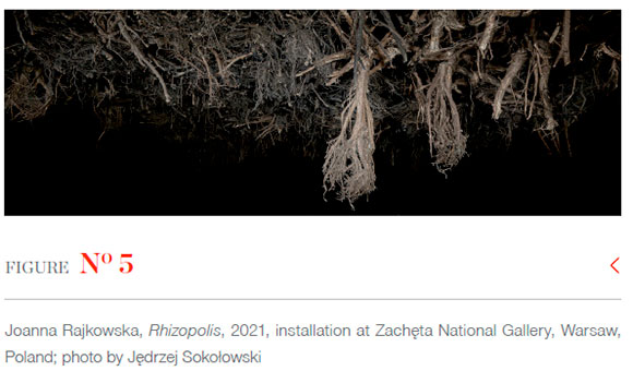 Rhizopolis portraying the remnants of post-apocalypse seems no longer fictitious. No trees were cut down for the installation created from excavated stumps. For over a year, Rajkowska and Urszula Zajaczkowska, a botanist and author of books including Patyki, badyle (Sticks, stems, 2019), visited logging fields in predominantly pine forests. Stumps of coniferous trees turned out to be monumental; too long and heavy for the installation envisaged for Zacheta. Hence, roots of younger trees were used, sourced from a dump nearby Warsaw for roots cleared from construction sites (see Figure 2). Rajkowska salvaged stumps from being chipped and burnt down in furnaces to create a space of co-nutrition and co-habitat.