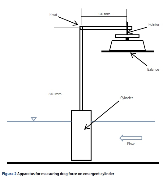 Calculation of the form friction factor by Equation 10 requires knowledge of CD. Values of CDfor emergent cylinders have previously been determined (e.g. Kothyari et al 2009; Tanino & Nepf 2008), but only for slender vegetation stems and lower values of element Reynolds number (Re¿) than obtained in this investigation (Red= Vd/v, with v being the kinematic viscosity of water and d the cylinder diameter). As the drag force on cylinders is known to depend strongly on size (Turcotte et al 2015), a series of tests were carried out to obtain estimates of CDfor the cylinders used in these experiments under emergent conditions. Drag forces were measured using the apparatus shown schematically in Figure 2, comprising two lever arms connected at right angles with a pivot at their vertex. A cylinder was attached to the vertical arm, with its base just clear of the flume bed, and a pointer on the horizontal arm was placed in contact with the pan of an electronic balance. Drag on the cylinder produced a measurable force on the balance which could be related to the drag force by moment equilibrium. Measurements were taken with a wide range of discharges and weir settings for single cylinders in isolation and in groups.