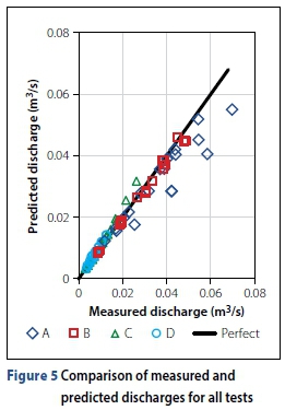 Values of Cdwere calculated by Equations 16, and the surface friction factors by Equations 17 to 19 with the calibrated coefficients (for the smooth channels the results using Equations 17 and 18 were indistinguishable). For the rough channels f /was determined by calculating fbfrom Equation 19 and then applying an inverse Vanoni and Brooks (1957) sidewall correction procedure to obtain a composite f /including the rough bed and smooth side walls. Discharge was calculated by multiplying the velocity by the cross-sectional area adjusted to account for the volume occupied by the cylinders. Predictions were found to be insensitive to the value of a, and a value of 2.5 (in the middle of the range suggested by Thompson and Roberson (1976)) was used throughout. The measured and predicted results are presented in Figure 4. The average absolute prediction errors for each experimental series were 9.9% for Series A, 3.9% for Series B, 10.2% for Series C and 9.5% for Series D. Predicted and measured discharges for all tests with cylinders in place are compared in Figure 5. This shows generally good agreement, except for the smooth channel cases with the lowest element densities.