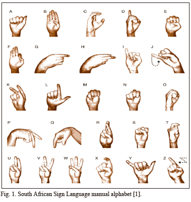 South African Sign Language, just like any other SL, is characterized by its phonology. The SL phonological parameters include handshape, palm orientation, location, movement, and non-manual features which are not executed using hands, such as facial expressions [4]. As shown in Fig. 1, the SASL fingerspelling alphabet consists of 26 manual letters of the English alphabet. These manual alphabet signs are divided into static and dynamic gestures. The dynamic gestures are for signing the letters "J" and "Z", as shown by the different handshapes and hand movements. The remaining letters are static gestures shown by handshapes only. Since SL does not have all words represented as signs, fingerspelling is an important part of SL. The English language, for example, has over 400 000 words, although only about 170 000 are in current use [5]. SASL does have over 1000 words, but fingerspelling is still very important for names, places, and objects. Fingerspelling often evolves into generally accepted signs as well. For example, the sign for the month of July, is the fingerspelling of J-U-L-Y. There are many of these cases.