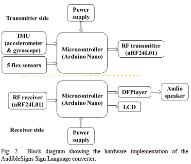 AudibleSigns is a device that converts SASL to text and speech to improve communication between hearing and nonhearing people. The main parts of the prototype are the wireless glove and the standalone wireless converter device (Figs. 2 & 3). Wireless technology was used to improve the comfort of the signer by removing any wires from the glove to the converter. The 2.4 GHz nRF24L01 wireless transceiver pair enables wireless communication between the glove and the converter device; thus, this is a two-part system-a transmitter side and a receiver side. The type of microcontroller board used for the glove and converter device is the Arduino Nano, based on the ATMEGA328 microprocessor. The prototype was designed for converting the SASL manual alphabet as well as words that do not have specific signs in the SASL dictionary. The messages were first converted from text to speech using an online text to speech service, and then the audio files were downloaded and stored on a microSD card. Rechargeable lithium polymer batteries were used owing to their smaller footprint and longer lifespan.