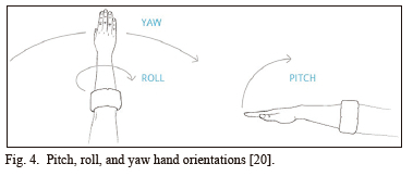 The MPU6050 was used as the inertial measurement unit (IMU) to measure the hand orientation and movement. It consists of a three-axis accelerometer and a three-axis gyroscope that measures the hand's acceleration and rotation, respectively. These were measured with respect to the pitch, roll, and yaw hand orientations as shown in Fig. 4. The acceleration and rotation are both converted to pitch, roll, and yaw angles measured in degrees. The values from the flex sensors and IMU are read as analog signals by the Arduino Nano. The Arduino Nano converts these analog signals to digital data using the onboard analog-to-digital converters. The nRF24L01 transmitter sends the data from the sensors as RF signals to the nRF24L01 receiver on the converter side.
