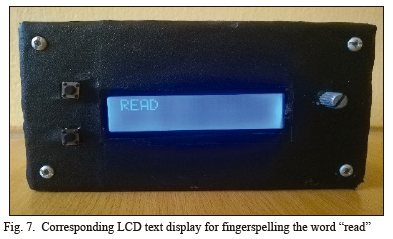 Examples of the performance of the AudibleSigns SASL converter are shown in Figs. 5 to 7. Figs. 6 and 7 show the conversion for words that do not have specific signs in the SASL dictionary. For such words to be converted to verbal, the letters of the words are individually finger-spelled. The LCD displays each letter of the word, one after the other, while the audio speaker mounted on the receiver plays the corresponding sound.