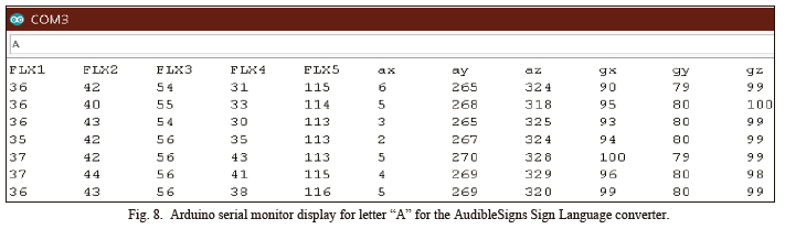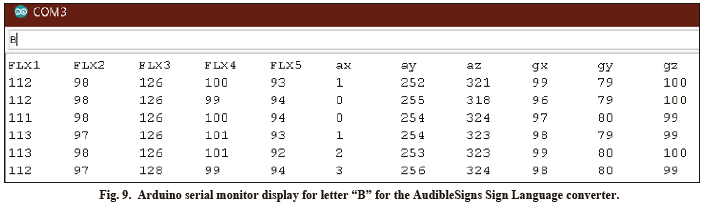 The flex sensors and IMU were calibrated using the Arduino serial monitor. Some of the calibration results for letters "A" and "B" are shown in Figs. 8 and 9. The labels FLX1-FLX5 are values for flex sensor readings measured in degrees, while ax, ay, and az are accelerometer readings. The readings shown as gx, gy, and gz are gyroscope values measured in degrees per second. The x-sets represent the pitch of the hand, the y-sets represent the roll, and the z-sets represent the yaw. Comparing Figs. 8 and 9, the gyroscope readings are almost the same, and owing to "A" and "B" being static gestures, there is no rotation of the hand. The accelerometer readings were mostly utilized for distinguishing static gestures.