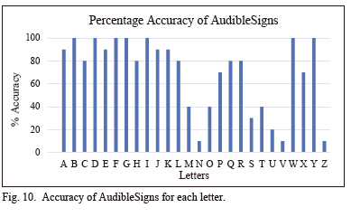 Fig. 10 shows the prototype's accuracy when signing all of the 26 letters of the manual alphabet. To determine the accuracy, 10 repetitions were completed for each letter, and a percentage accuracy was ascertained. Of the 26 letters, 18 had an accuracy of at least 70%; eight had an accuracy of 40% or lower. Of the 18 letters with 70% accuracy or better, the average accuracy was 86.8%. The average accuracy of all 26 letters was 69.6%. It was easier to sign words that had letters with an accuracy higher than 40%. These words are those with signs that are not found in the SASL dictionary and require fingerspelling of each constituent letter. The word "read" was tested as an example. Furthermore, the phrase "thank you" with specific dynamic signs in the SASL dictionary was tested and had 100% accuracy.