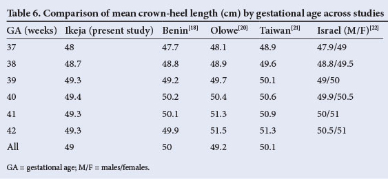 The mean length of babies in the current study (49.0 cm) is comparable to the 49.1 cm reported from Ilesa, southwestern Nigeria,[33] 49.2 cm and 50 cm from other Nigerian series,[18,20] 48.6 cm in Ethiopia,[25] 49.8 cm in Southampton, UK,[23] and 50.1 cm reported for Chinese newborns.[3] It is, however, much higher than the 47.7 cm reported from Pune in India.[26] As with the observations on birth weight, the babies in the current series were slightly longer than those in the series from Nigeria[18,33] at 37 - 39 weeks, but somewhat shorter at older gestational ages. Overall, the figure in the current study falls within a narrow range of 49 - 51 cm reported in other studies (Table 6).