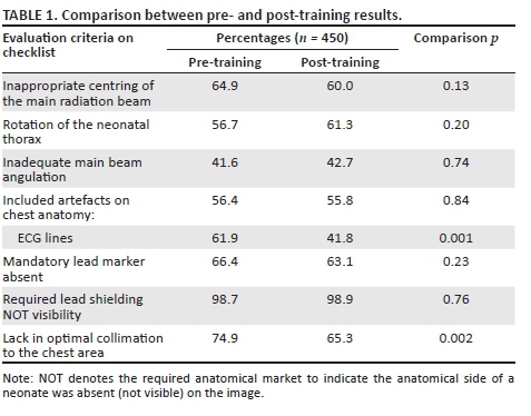 METHODS: Neonatal chest image quality was determined in the Neonatal Intensive Care Unit by using a checklist based on and compiled from published guidelines to evaluate the quality of 450 randomly-selected images. Thereafter, a training programme was designed, based on the evaluation criteria of the checklist and image quality areas identified. The training also referred to positioning techniques that should be applied to ensure optimal image quality. After presentation of the training, 450 newly-produced neonatal chest images were evaluated. These images were selected through purposive sampling as this evaluation only included images of participating radiographers who completed the training.