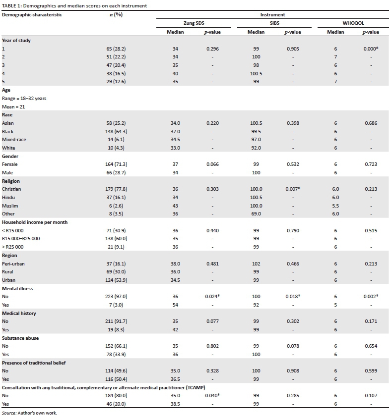 from each year of study was highest at first year level (28.2%) and decreased in a linear fashion through second year (22.2%), third year (20.4%), fourth year (16.5%) and fifth year (12.0%). Ethnic (racial) representation was predominantly black (64.3%), followed by Asian (25.2%), with relatively few mixed-race (6.1%) and white (4.3%) participants. The main religion was Christian (77.8%), followed by Hindu (16.1%), with very few Muslim (2.6%) and Other (3.5%). Most participants were in the middle R15 000-R25 000 per month income bracket (60.0%), followed by the less than R15 000 per month bracket (30.9%) and the higher over R25 000 per month bracket (9.1%). Just over half (53.9%) lived in urban areas, just under a third in rural areas (30.0%) and the remainder in peri-urban areas (16.1%). Other background information indicated current mental illness (3.0%), other current medical conditions (8.3%), substance abuse (33.9%), presence of traditional beliefs (50.4%) and consultation with any traditional, complementary or alternate medical practitioner (TCAMP) (20.0%). Demographic traits are compiled in Table 1 together with the median scores on each instrument.