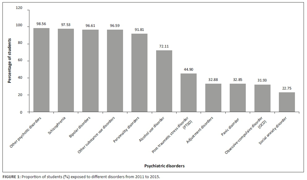 Figure 1 shows the proportion of students exposed to different psychiatric disorders from 2011 to 2015. Medical students were most frequently exposed to mentally ill patients with other psychotic disorders (98.56%), schizophrenia (97.53%), bipolar disorders (96.61%), substance use disorders, other than alcohol use disorder, (96.59%) and personality disorders (91.81%). Fewer students were exposed to mentally ill patients with PTSD (44.90%), adjustment disorder (32.88%), panic disorder (32.85%), OCD (31.93%) and social anxiety disorder (22.75%).