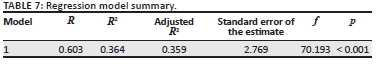 Table 7 shows the regression model summary. With the adjusted R-square of 0.359, the model predicts that 35.9% of variability in depressive symptoms is explained by age, social support, resilience and anxiety symptoms.