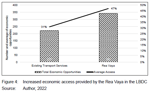 As per Figure 4, the introduction of the Rea Vaya BRT system increased access to economic opportunities by 16%. Much of this increase can be attributed to the fact that the Rea Vaya bus stations are located along Louis Botha Avenue, the spine of the development corridor around which economic facilities congregate and develop, while existing transport services and their associated bus stops and stations are located along through and local streets.
