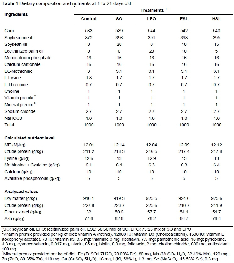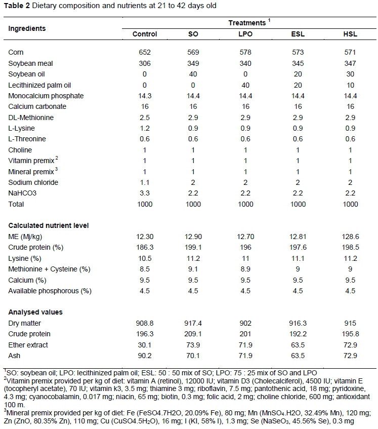 Three hundred and sixty day- oId maIe broiIer chicks (Ross 308) were purchased from a commercial hatchery and used in this experiment. At arrival, chicks were weighed, wing banded, and assigned to treatment groups so that the initiaI weight was similar among treatments (45 ± 0.5 g). Six replicates comprising 30 cages of 12 chicks each/// were randomly allotted to five dietary treatments in a completely randomized design across starter (1-21) and growing-finishing (21 -42) periods. Diets were in mash form, and the inclusion leveIs of experimentaI fats were 2% and 4% in the starter and growing periods, respectively. Dietary treatments included a basal diet with no supplemented fat and either soybean oil (SO), Iecithinized paIm oiI (LPO), a 50 : 50 mix of SO and LPO (ESL) and a 75 : 25 mix of SO and LPO (HSL) ratios added to the basaI diet. ExperimentaI diets were formuIated to meet or exceed NRC (1994) recommendations (Tables 1 and 2). Chicks were housed in 1 24 ₓ 65 cm battery cages and had free access to feed and water through out the triaI. The ambient temperature was graduaIIy decreased from 33° C at first week to25 ºC on day 21 and was then kept constant. The lighting programme consisted of 23 hours light and 1 hour darkness. All the experimental procedures were evaluated and approved by the Institutional Animal Care and Ethics Committee from the Islamic Azad University, Isfahan (Khorasgan) Branch.