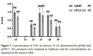 The extraction methods and analyses were also applied to extracts from local flower samples. CBD was not detected in the extracts, however, THC was detected and quantified using both qNMR and qHPLC and again, the concentrations determined were generally in good agreement. With percentage differences between concentrations determined by qNMR and qHPLC ranging between 2-20%.