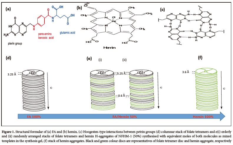 This report discusses how NFHM-1 and NHM-1 were prepared by introdicing hemin to replace equivalent moles of FA in NFM-1 synthesis protocol at RT and 40°C. We derive information on the self-assembly, interactions between ionic species, nucleation, and growth processes through in-situ conductivity measurements. In addition, the effect of hemin on the stacking of the folate, evidence of incorporation of hemin within the hybrids, optical properties, morphology and sizes of these asynthesised materials are determined by non-destructive techniques. The intensity of low angle and folate stacking' peaks progressively decreases as the moles of hemin introduced to the synthesis gels increase to replace that of FA. All the samples with hemin exhibit characteristic Soret band and the Q bands which are weakly resolved as the mole of hemin in the template mixture decreases. Similarly, the emission spectra of these materials display a series bands in that the band at 604 nm decreases in intensity as FA decreases to hemin in the synthetic gels.