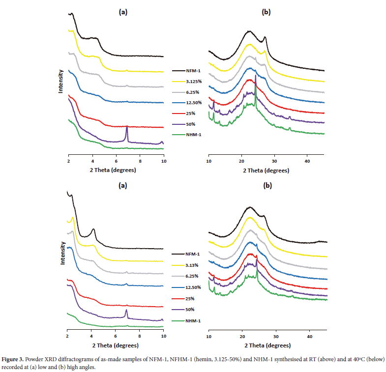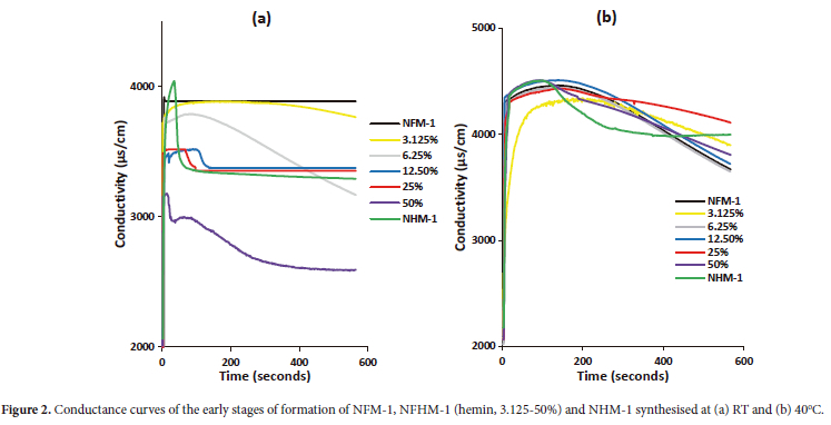 For NFM-1, a monotonic decrease in the conductivity curve was observed after maximum conductivity was reached, but a gradual decline in the conductivity was seen for the sample with 3.125% hemin, which became more rapid with the increase in concentrations of hemin. This noticeable decline in conductivity over time is as result of the consumption of charged species accompanied by condensation of hydrolysate species that give rise to silica/template mesophases. An obvious discontinuity can be seen between 38 and 130 s for syntheses with (6.25-100%) hemin, while that for the other systems appeared at a higher time range due to slower hydrolysis (Figure 2a). After the initial stage of synthesis, the samples were left unstirred to age for a day. As aging time significantly affects the properties of mesoporous silica, this allows for the continuation of the growth process over time until homogeneous or uniform particle sizes are attained.28 The maximum conductivity was higher for samples synthesised at 40 oC than that at RT, as is typical for electrolytes. These samples' discontinuity was observed at a higher timescale, which implies slower hydrolysis as compared with syntheses at RT, and expectedly condensation rate is faster (Figure 2b). It was observed that the rate of hydrolysis increases as the amount of hemin increases in the reaction mixtures. Hence, the sample with hemin on its own as a template displayed discontinuity at 258 s and the others appeared at a slightly higher time range.