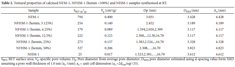 Textural information of these samples was obtained from sorption isotherms (see Figure 5a and b). The isotherms in Figure 5a are true to form as with materials with mesopores,30 have monolayer-multilayer adsorption at relatively low pressure (p/po 0.05-0.2), with a rare hysteresis loop within 0.45 to 131,32 that accompanied capillary condensation. This loop indicates the dissimilarity between the adsorbed and the desorbed N2, of which size gradually increases for samples with 12.5-50% hemin to FA. However, all the samples with less than 12.5% hemin and absolute hemin except for NFM-1 have the least hysteresis loop size of approximately 1 cm3/g, STP (standard temperature and pressure). This particular type of hysteresis loop might show some defects in the hexagonal channel matrix of this mesoporous silica.33 Figure 5(b) illustrates the distribution curves of the pore size centred around 3.09, 2.45, and 2.31 nm for samples synthesised with fractions of hemin < 12.5%. On the other hand, the other samples displayed primary mesopore centred at about 16.7 nm, accompanied by secondary mesopores, in addition, samples with 25 and 100% hemin possessed micropores at about 1.55 nm in the same range as that with 6.125% hemin. The incremental pore volume for mesopores between 8.2-17 nm increases for NFHM-1 (hemin, 12100%) as the concentration of hemin increases in the synthesis gels.