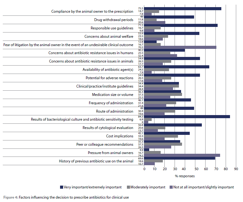 Persistent infection (89; 87.3%), recurring infections (73; 71.6%), and client finances (48; 47.1%) were the most important factors in influencing the decisions of veterinarians to submit samples for microbial culture and susceptibility testing. Results of bacteriological culture and antibiotic susceptibility (86; 84.3%), animal owner compliance with the prescription (77; 75.5%), clinical signs (75; 73.5%) and appropriate use guidelines (73; 71.5%) were considered to be very important in determining the need for and choice of antibiotics while pressure from clients (76; 74.5%), fear of litigation by the animal owner in the event of an undesirable outcome (72; 70.5%) and concern about antibiotic-resistant infections in humans (33; 32.4%) were slightly important (Figure 4).
