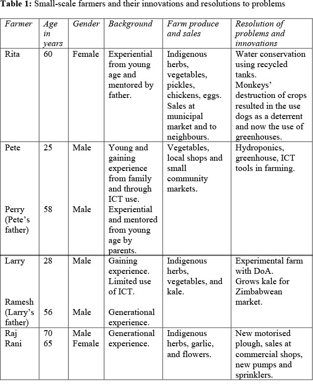 The data and data analysis are presented as a case narrative history of each farmer's social, cultural and political background, their knowledge and skills of agriculture, their farm economics, produce and sales and resolution of problems and innovations in farming. All farmers' details are summarised in Table 1. The farmers were assigned pseudonyms. The results of the multi-case study are presented as a discussion analysed through critical pedagogy.