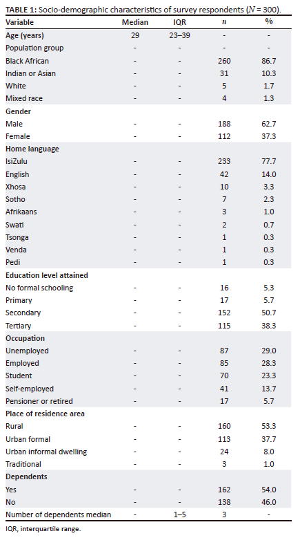 Participants had a median (interquartile range [IQR]) age of 29 (23-39) years and the majority were black African (86.7%) and male (62.7%). IsiZulu was the most common home language spoken by 233 (77.7%) participants and 160 (53.3%) resided in a rural area (Table 1).