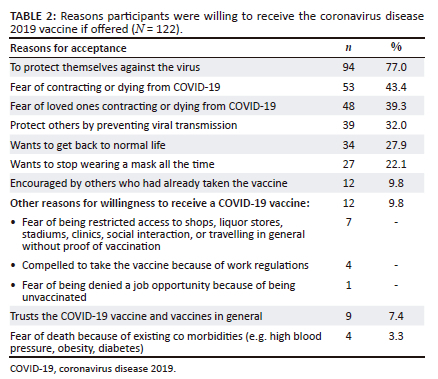 Participants provided various reasons for their willingness to receive a COVID-19 vaccine, and all relevant reasons were documented (see Table 2). The primary motivation cited was self-protection, with 77% of participants indicating this as their main reason.