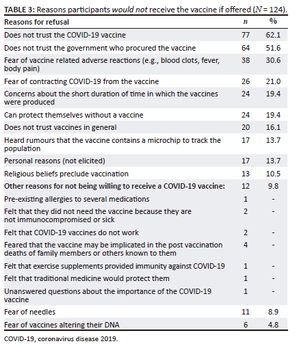 There are conflicting reports on the association of gender and COVID-19 vaccine hesitancy. This study found no gender-based differences in vaccine hesitancy. While there might have been fewer women than men in this study, making it challenging to demonstrate significant differences, other studies have indicated that men are more likely to exhibit vaccine hesitancy (Babalola et al. 2020, Runciman et al. 2021), while data from the Africa Centres for Disease Control and Prevention (CDC) (2021) showed that willingness to accept the COVID-19 vaccine is similar across genders (73% of men vs. 78% of women). In this study, vaccine hesitancy increased with the level of education, in line with other findings (Engelbrecht et al. 2022; Runciman et al. 2021); however, these data did not reach statistical significance. Furthermore, participants who were employed reported to be more likely to get vaccinated than those who are unemployed or self-employed. This could be attributed to the impact of restricted movement and lockdowns on the informal business sector, which eroded the trust in government and influenced vaccine uptake (Paul, Fancourt & Razai 2022)