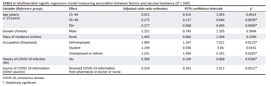 All variables that were significant in the univariate analysis were included in the multivariate analysis (Table 6). In addition, variables of interest that have been shown to be associated with vaccine hesitancy were also included in the model.