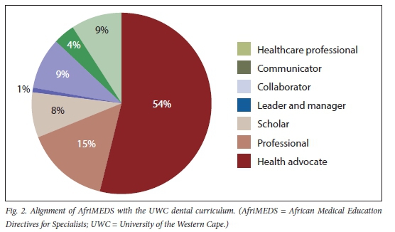 From the results of the curriculum mapping (Tables 1 and 2), the alignment of the UWC dental curriculum to AfriMEDS was demonstrated. It is clear that all the roles indicated by AfriMEDS were included in the curriculum (Fig. 2). This dental curriculum focused mostly on the healthcare professional (54% of curriculum), which is expected in a health professions training context. Inclusion of the other competencies was demonstrated to be much less. Communicator (15%) appeared to have an acceptable presence in the curriculum. However, collaborator, leader and manager, scholar, health advocate and professional roles were not very prominent, demonstrating a presence of <10% in the curriculum.