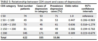 Patients with a lower CD4 count demonstrated higher levels of depressive symptomatology, most significantly in patients with a CD4 count of 50 or less (Table 5).