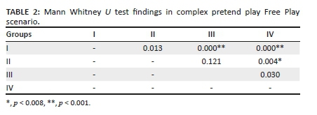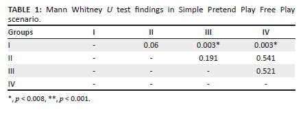 METHOD: The study followed a cross-sectional study design. Forty-eight participants were recruited for the study and were divided into four groups. A video recording of the child's pretend play skills was recorded using a Sony-HDRCX405 camcorder in Free Play and Structured Toy Play scenarios. The recorded video was coded and analysed for the occurrence of pretend play skills using the Play in Early Childhood Evaluation System (PIECES) coding scheme