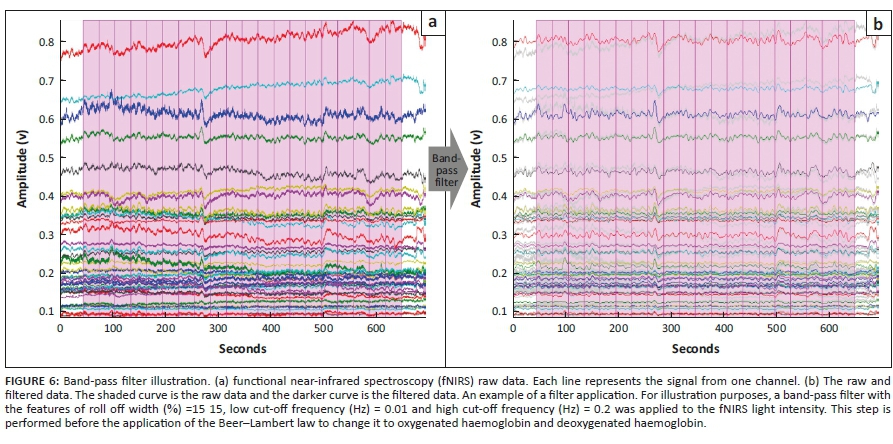 A pre-processing process is performed to remove or to diminish the artefacts before computing any statistical analysis with the fNIRS data (Behrendt et al. 2018; Di Lorenzo et al. 2019). The noise related to physiological artefacts can be attenuated by applying frequency filters (Figure 6) as proposed by Nguyen et al. (2018) and Pinti et al. (2019). The short-distance channels are those with source-detector distances usually less than 1 cm, and they measure non-brain signals from the skull and scalp. Computational and mathematical manipulations of these values have been used to remove the artefacts related to the non-brain sources (Brigadoi & Cooper 2015; Zhou et al. 2020). Thus, the approach to remove or to diminish the noise effects varies according to the artefacts' type and source (Tak & Ye 2014).