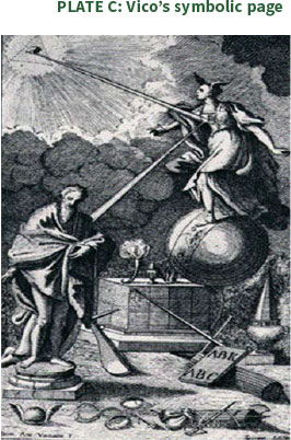 Plate B is the frontispiece in Voltaire's Elements die philosophie de Neuton; check Plate C that of Vico's Scienca nuova. Plate C appeared about 25 years before Plate B. In Plate B Newton is seen measuring the globe. Emily du Chatelet, Voltaire's life companion, represented as a Muse reflecting the divine light, and Voltaire in Caesarist habit the announcing scientist below. In Vico, the divine providential eye as the Platonist light source, casts its light via dame Metaphysics onto Ancient history (Homeros) - the source of social natural law, while she is standing on the universe (the source of physical natural law).