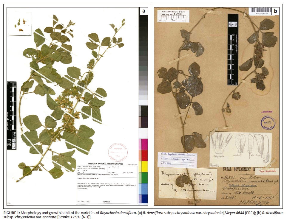 RESULTS: In South Africa, the section was until now represented by two species, Rhynchosia densiflora (subsp. chrysadenia) and R. connata. These were separated primarily on stem indumentum, stipule shape, petiole length, leaflet shape and apices. However, this study revealed that there are no clear discontinuities between the two taxa apart from the lobes of the uppermost calyx lip, which are connate more than halfway in R. connata and up to halfway in R. densiflora subsp. chrysadenia. Therefore, R. connata is here relegated to varietal level as R. densiflora subsp. chrysadenia var. connata (Baker f.) Jaca & Moteetee