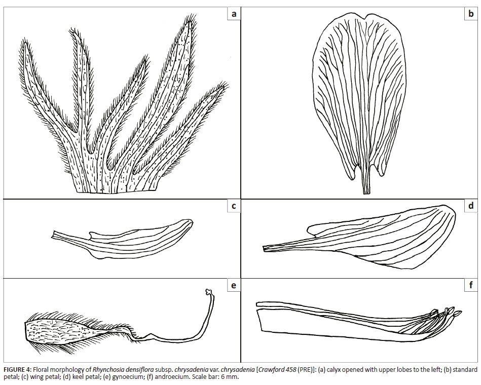 The R. densiflora group is characterised by flowers mostly in dense sessile, subsessile or pedunculate racemes. The inflorescences are axillary racemes and comprise many flowers, a character that is considered ancestral in Rhynchosia (Grear 1978). The inflorescence varies from 10 mm to 130 mm long or more (Grear 1978). The extent of fusion of the upper calyx lobes is a useful diagnostic character between typical R. densiflora subsp. chrysadenia and R. densiflora subsp. chrysadenia var. connata; in the former, the upper calyx lobes are connate up to halfway, whereas in the latter the upper calyx lobes are connate to more than halfway. The standard petal is glabrous and eglandular. The lamina of the wing petal is generally oblong, without surface sculpturing, and is glabrous. There seems to be some variation in keel petal length and width in R. densiflora subsp. chrysadenia, and in var. connata the keel is slightly narrower (8 mm × 4 mm) than in var. chrysadenia (10mm - 12mm × 3 mm - 4 mm).