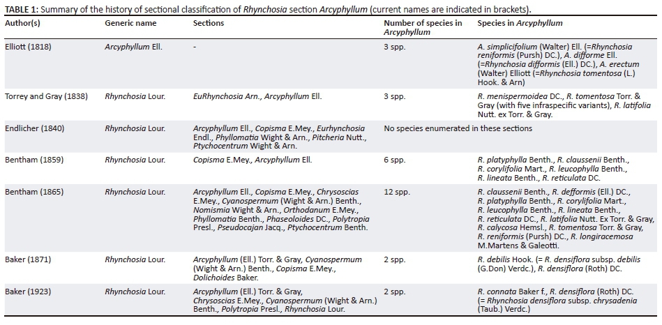 Bentham (1859) discussed ten South American species of Rhynchosia, of which four were newly described, treated in sect. Copisma comprising four species, viz. Rhynchosia phaseoloides (Sw.) DC., Rhynchosia minima DC., Rhynchosia senna Hook. and Rhynchosia lobata Desv., and sect. Arcyphyllum consisting of six species, viz. Rhynchosia platyphylla Benth., Rhynchosia claussenii Benth., Rhynchosia corylifolia Mart., Rhynchosia leucophylla Benth., Rhynchosia lineata Benth. and Rhynchosia reticulata DC. Bentham (1865) recognised 72 species of Rhynchosia worldwide and placed them in 11 sections [sect. Arcyphyllum (Ell.) Torrey & Gray (12 spp.), sect. Chrysoscias E.Mey. (4 spp.), sect. Copisma (30 spp.), sect. Cyanospermum Wight & Arn. (2 spp.), sect. Nomismia Wight & Arn. (3 spp.), sect. Orthodanum E.Mey. (4 spp.), sect. Phaseoloides Mart. (4 spp.), sect. Phyllomatia Wight & Arn. (2 spp.), sect. Polytropia Presl. (2 spp.), sect. Pseudocajan Jacq. (4 spp.) and sect. Ptychocentrum Wight & Arn. (5 spp.)]. These 11 sections were again presented by Taubert (1894), but he estimated that there were now more than 100 species. In his treatment of the Flora of Tropical Africa, Baker (1871) placed two African species (Rhynchosia debilis Hook. and R. densiflora DC.) in section Arcyphyllum based on their twining habit and the densely clustered flowers. The former species was reduced by Verdcourt (1971) to a subspecies of R. densiflora. In his revision of the genus in South Africa, Baker (1923) retained R. densiflora in this section and added a new species R. connata Baker f. The distinction between these two species was based on the shape of the terminal leaflet (broadly ovate and acuminate in R. densiflora and rhombic-ovate and obtuse in R. connata). A summary of the history of sectional classification of Rhynchosia section Arcyphyllum is presented in Table 1. Baker (1923) further merged sect. Copisma and sect. Orthodanum into sect. Eurhynchosia, now treated as sect. Rhynchosia.