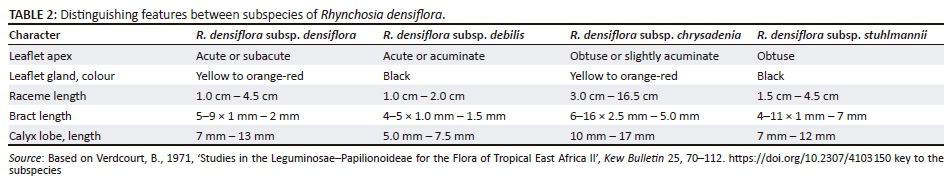 In recent checklists and floristic treatments (Germishuizen et al. 2006; Gillett et al. 1971; Verdcourt 1971), R. densiflora has been considered to comprise four subspecies, that is, R. densiflora subsp. densiflora, R. densiflora subsp. chrysadenia (Taub.) Verdc., R. densiflora subsp. stuhlmannii (Harms) Verdc. and R. densiflora subsp. debilis (G.Don) Verdc., with only R. densiflora subsp. chrysandenia occurring in South Africa. Verdcourt (1971) differentiated these taxa based predominantly on the length of the inflorescence. The differences are summarised in Table 2. Based on Verdcourt's (1971) circumscription, R. connata falls within the R. densiflora complex in that it has a similar growth form (climbing, procumbent perennial herbs about 0.8 m long), obtuse leaflets and yellow glands on the leaflets. According to Baker (1923), R. connata differs from R. densiflora mainly in the shape of the terminal leaflet (rhombic-ovate in the former and broadly ovate in the latter) as well as stipule shape (ovate in R. connata vs. lanceolate in R. densiflora), and the length of the terminal leaflet petiolule (8 mm - 10 mm in R. connata vs. 10 mm - 18 mm in R. densiflora). Examination of numerous herbarium specimens has however revealed that within R. densiflora itself, there is a great deal of morphological variation, and therefore none of these characters can be used for diagnostic purposes in separating these two taxa. It is important to mention that descriptions of R. connata are based on the type specimen only. Verdcourt (1971) observed that the East African plants of the R. densiflora complex exhibit a wide range of morphological variation and as a result concluded that the colour of the glands on the leaves and calyx lobes appears to represent 'a more accurate picture of the evolution of the species' (i.e. R. densiflora). The colour of glands places R. connata firmly in this complex, from which it differs only in the size and the extent of connation of the lobes of the uppermost calyx lip. Therefore, this taxon is here included in R. densiflora as R. densiflora subsp. chrysadenia var. connata (Baker f.) Jaca & Moteetee.