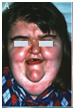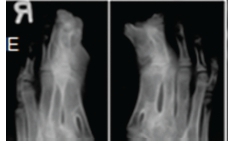 A diagnosis of Apert syndrome was made. Apert syndrome is a rare developmental condition characterized by premature cranial synostosis and resultant growth disturbances. Signs of Apert syndrome include a peaked and vertically elongated head, widespread bulging eyes, and a protuberant frontal region with an anteroposterior ridge overhanging the frontal eminence (Figure A). The palate is high, arched and occasionally cleft (Figure B). There is hypoplasia of the maxilla with relative prognatism of the mandible. Dental malocclusions with crowding and delayed dental eruption in the maxilla are common (Figure C). The facial angle is exaggerated; the nose is small and has been compared to a parrot's beak in appearance. Hypertelorism, exophthalmos and divergent strabismus are often present; sometimes with blindness. Spina bifida has been recorded in some patients. Syndactyly of the hands and feet varies greatly. Hand films in Apert syndrome showing syndactyly with fusion of three fingers in both hands and webbing (Figure D). Syndactyly of the feet in the same patient is also discernible (Figure E) Note the tall (turricephalic) skull, open metopic suture, and faint beaten-silver appearance of the calvarium. Skull base and roof of the calvarium are flattened, with a noticeable beaten-silver appearance (Figure F). The 3-D CT reconstruction of the same patient showing hypoplastic maxilla with posterior cleft (Figure G) The patient may be retarded or of normal intelligence. Apert syndrome may be associated with advanced paternal age. The cardinal radiologic features of Apert syndrome are: Brachycephalic (reduced anteroposterior dimension of the skull with increased skull width). Turricephaly (occurrence of a skull with high vertical index), beaten silver appearance of the calvarium, absence of demonstrable cranial sutures in coronal dimension in young patients, hypoplastic maxilla and syndactyly of the hands and feet. Differential Diagnosis: Crouzon's disease, Pfeifer syndrome, Carpenter syndrome and Summit syndrome.