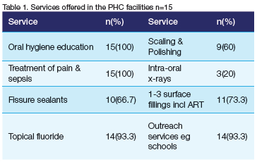 Each participant received an information leaflet and consent form to read and sign if they agreed to participate in the study. A self-administered questionnaire drawn up with Microsoft Word was used to collect data. The questions were taken from the Primary Healthcare Package for South Africa: A Set of Norms and Standards.7 The questionnaire was distributed to a dental clinic staff member and included closed-ended questions about the presence of key staff members such as dentists, dental therapists, dental assistants, oral hygienists and receptionists. Additionally, it inquired about the availability of various dental services, requesting information on the hours dedicated to each service and barriers preventing their delivery.