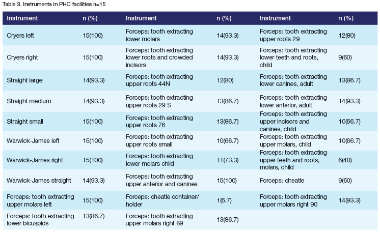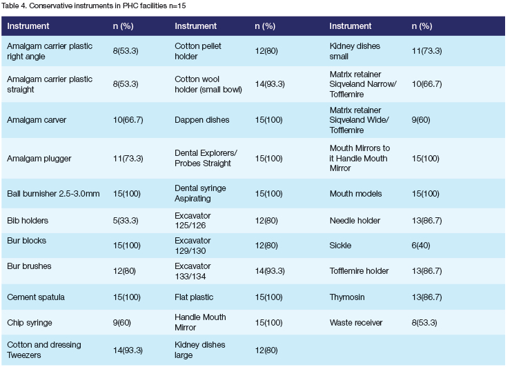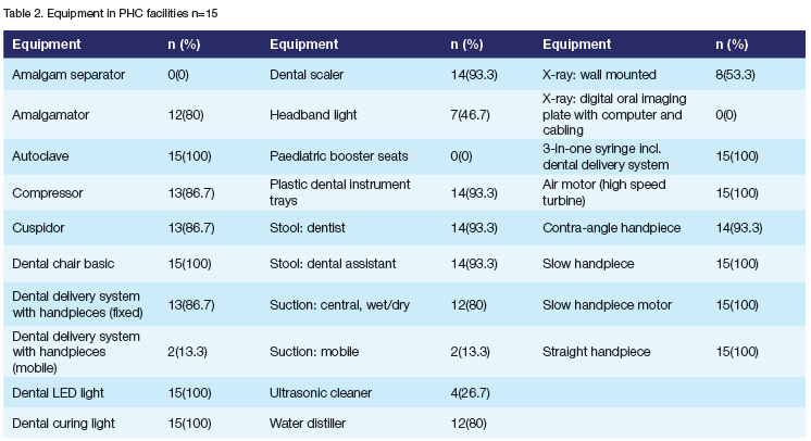 Aims and objectives: The study evaluates the availability of prescribed dental consumables, instruments and equipment in primary oral health clinics. Additionally, it seeks to determine the number of clinics providing the basic package of oral health services.