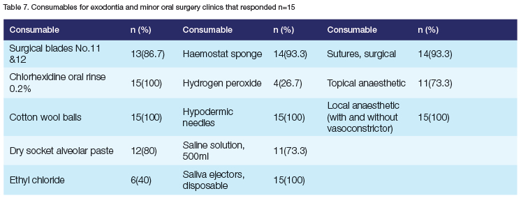 Certain consumables exhibited a remarkably high presence, with items such as chlorhexidine oral rinse (0.2%), cotton wool balls, disposable saliva ejectors, hypodermic needles and local anaesthetics (both with and without vasoconstrictor) universally available in all 15 clinics. Haemostat sponges and surgical sutures were found in 93.3% of clinics. Dry socket alveolar paste was found in 80% of clinics and saline solution (500ml) was available in 73.3% of clinics.
