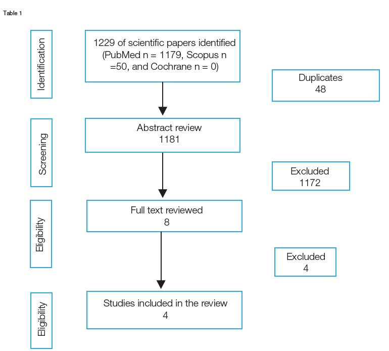 The database search yielded 1229 research papers. The articles were screened, and 48 duplicates and 1172 unrelated studies were removed. The remaining four articles were reviewed by independent researchers and included in this review. (Table 1) Two of the four studies included in the review were case-control studies, and the remaining two were retrospective studies.4,8,17,18 All the included studies were published in English within the last 10 years.