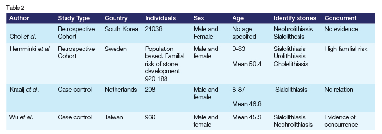 Three of the four papers included in this review showed no association between urolithiasis and sialolithiasis. However, Wu8. et al. found a significant association between sialolithiasis and urolithiasis in the Taiwanese population. Reasons for this association may include ethnic differences and surveillance bias. There is well known variation among ethnic groups regarding the prevalence of urolithiasis, with diet and lifestyle, as well as genetic factors playing a role in predisposition to calculi formation.23 In addition, there is a risk of surveillance bias. The patient is already closely monitored within the healthcare system due to their primary disease; consequently, detecting other conditions is more likely. In this case, sialolithiasis is commonly an asymptomatic condition; most people may go undetected if not for regular visits to healthcare facilities and routine checks. Consequently, detecting sialolithiasis in these patients may have been incidental rather than an association. This is supported by the findings of Choi18 et al. (2018), in which the number of participants diagnosed with sialolithiasis in the control group (0.1%, 92/96,152, P = 0.447) was larger than the experimental group who had a history of urolithiasis (0.08% (19/ 24 038).