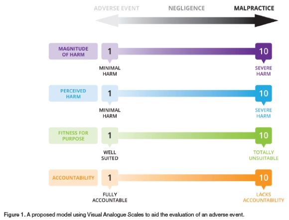Determining whether an incident in healthcare is an adverse event, negligence or malpractice can be challenging. The authors previously proposed a three-pronged model considering the magnitude of harm, the frequency of similar incidents and the intention behind the actions. However, on reflection and testing, they have identified limitations in the model. Magnitude is subjective, frequency is difficult to gauge and intention is impossible to assess. The authors now propose a refined template that replaces Frequency with Perceived Harm, better defines how Magnitude can be gauged and replaces Intention with a more objective measure of Fitness for Purpose. It also introduces a fourth category of Accountability (a measure of professionalism). The updated model includes a graphical representation using Visual Analogue Scales, with the aim to aid in determining whether an incident is an adverse event, negligence or malpractice. The respondents/assessors will mark a point on each of the four scales that best indicates their assessment of that category. These points can then be measured and the totals used to rank the severity of the incident. This paper once again emphasises how important it is for clinicians to maintain accurate and detailed records, the need for teaching and practicing evidence-based medicine, of prioritising the patient's best interests, and of timely reporting of suspected misconduct to the HPCSA in order to protect patients.
