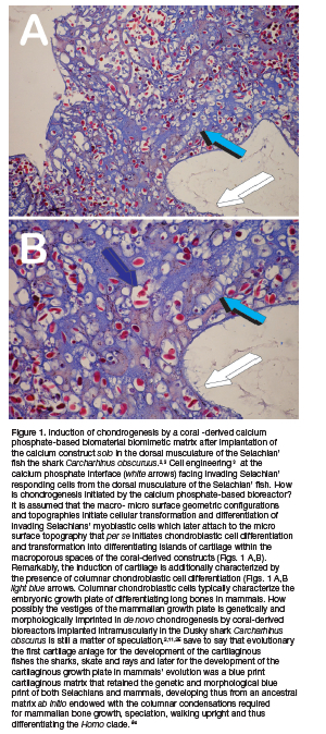 These altogether interesting and certainly difficult question proposes the first digital images of the manuscript, the extraordinary induction of chondrogenesis by a coral-derived macroporous hydroxyapatite-based bioreactor when implanted solo in the dorsal musculature of the Selachian' fish, the dusky shark Carcharhinus obscurus (Fig. 1).2,3